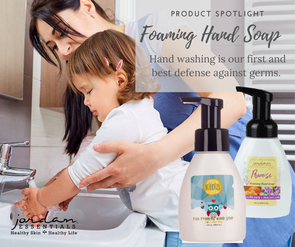 Start by placing a bottle of our foaming hand soap at each sink in your house.  Jordan Essentials Foaming Hand Soap is available in a variety of fragrances and essential oils to please everyone in your home. Try setting out a fresh bottle of hand soap in the restroom at work to promote healthy hand washing throughout the office too.